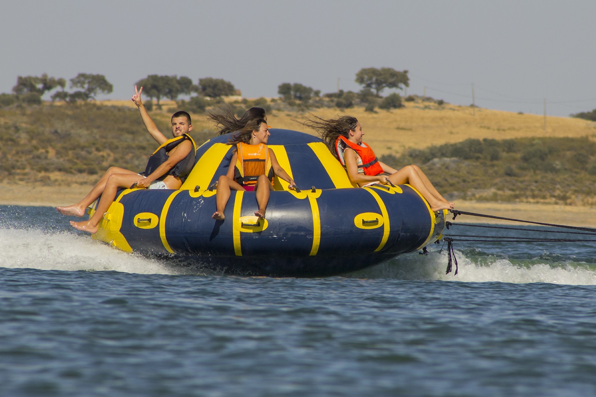 Na Praia Fluvial de Monsaraz, a diversão dentro de água é garantida! Explore as águas calmas do Alqueva com kayak, stand-up paddle e gaivotas a pedais, ideais para momentos descontraídos em família ou com amigos.Para os amantes de adrenalina, desafie-se com wakeboard, ski aquático e bóias de tração, como a emocionante banana, ovni e donuts, perfeitas para despedidas de solteiro(a) ou experiências inesquecíveis em grupo.