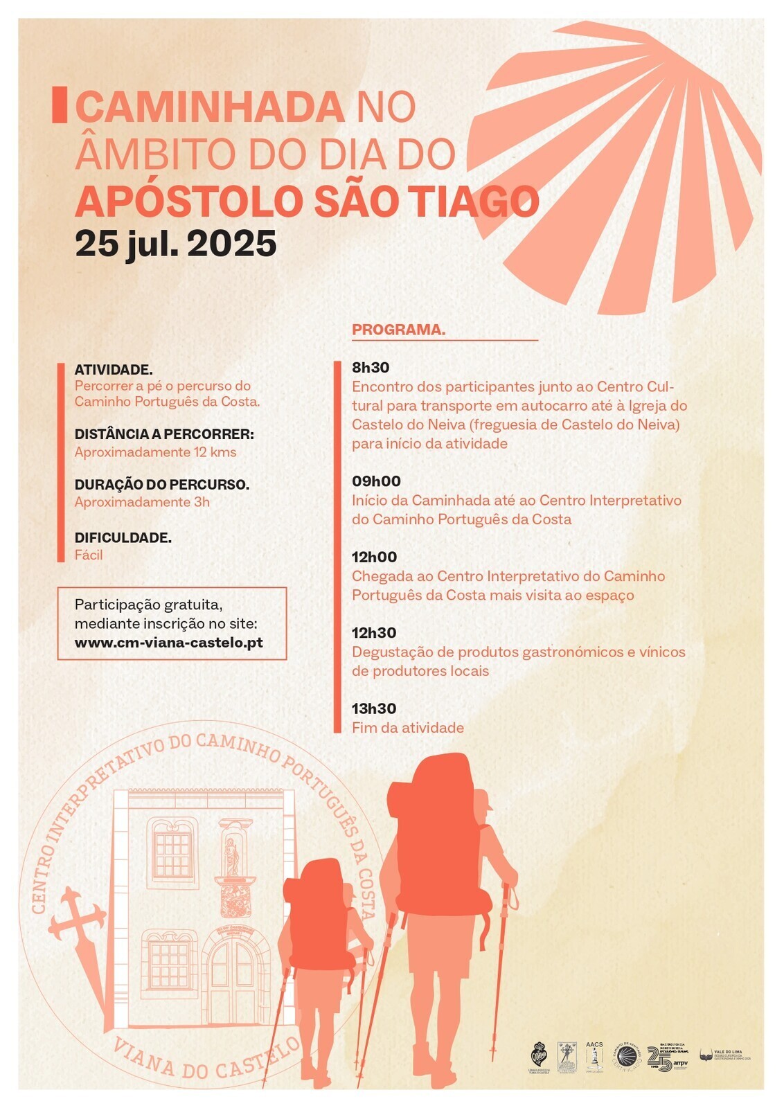 No dia 25 de julho, realizar-se-á uma caminhada em honra do Apóstolo São Tiago. A atividade irá permitir percorrer a pé o percurso do Caminho Português da Costa, desde a Igreja do Castelo do Neiva até ao Centro Interpretativo do Caminho Português da Costa.