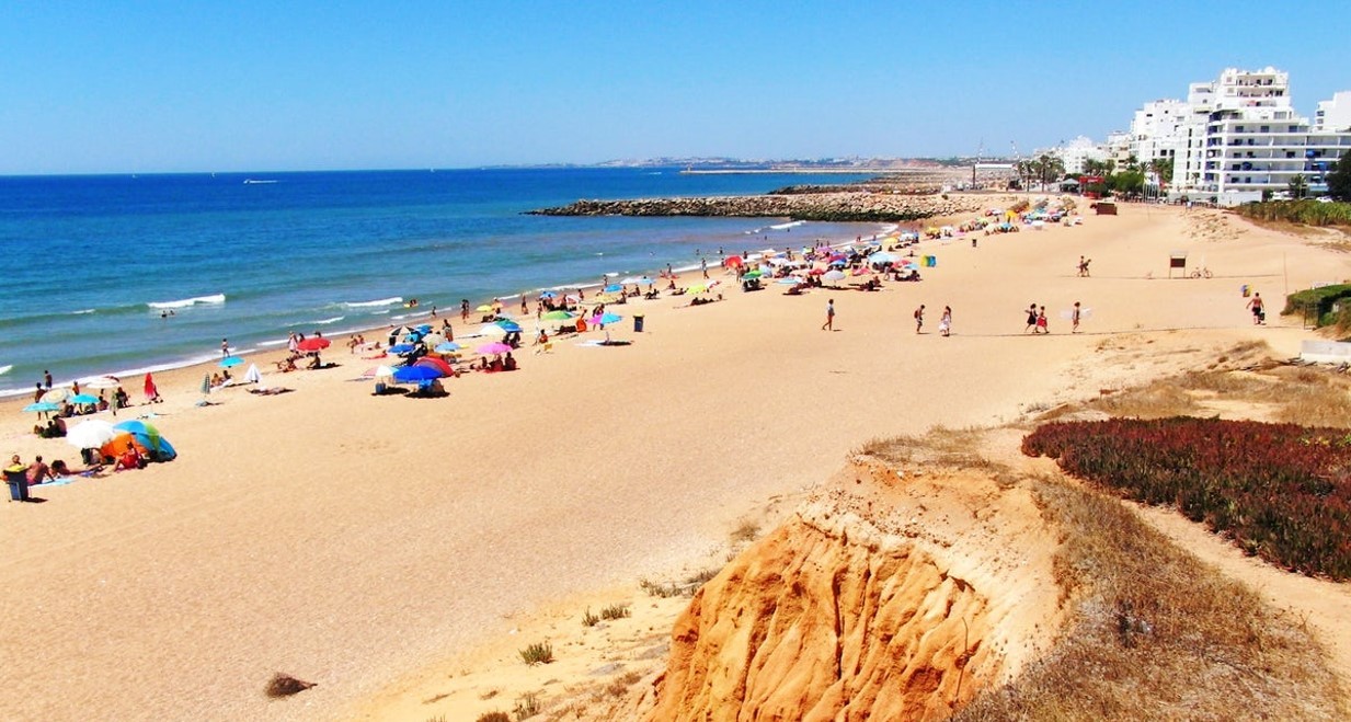Espontânea e versátil, situa-se na zona de transição do espaço urbano de Quarteira para uma área natural de dunas extremamente sensíveis. Apresenta um extenso areal e oferece condições privilegiadas de acessibilidade e mobilidade para todos. A nascente, as arribas de intensa cor ocre contrastam com o verde dos pinhais. Em maré baixa, é possível observar vestígios do Forte Novo, edificado no reinado de D. João II.