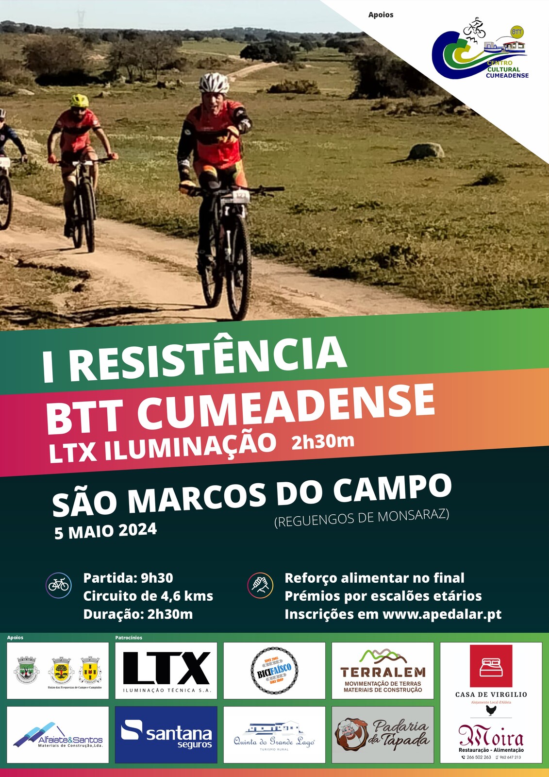 A 1ª Resistência BTT CUMEADENSE / LTX ILUMINAÇÃO é organizada pela secção de BTT do Centro Cultural Cumeadense, com o apoio da Câmara Municipal de Reguengos de Monsaraz e da União de Freguesias de Campo e Campinho.