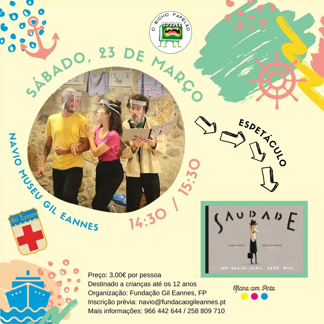 No âmbito da participação da Fundação Gil Eannes, FP na 3ª Edição da Agenda Nacional “À Descoberta do Turismo Industrial”, que se realizará de 16 a 30 de março, será realizado a bordo do Navio Gil Eannes um espetáculo com o tema “Saudade”, pelo trio contador de histórias O Bicho Papelão, no sábado dia 23/03, às 14h30 e às 15h30.