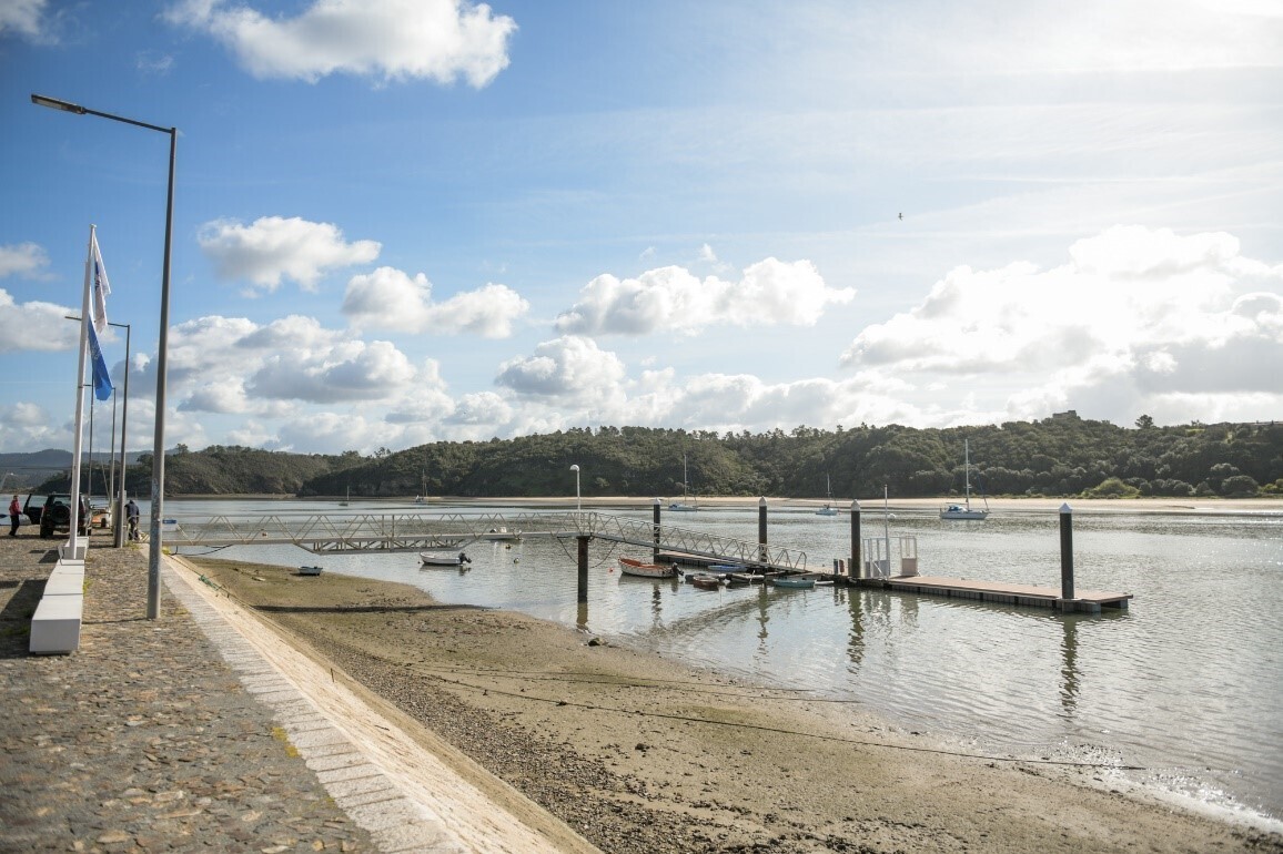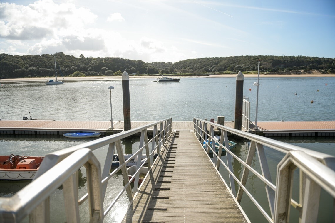 Cais fluvial público de acesso ao Rio Mira. Próximo, destaca-se o passadiço que oferece aos caminhantes uma belíssima paisagem ribeirinha.