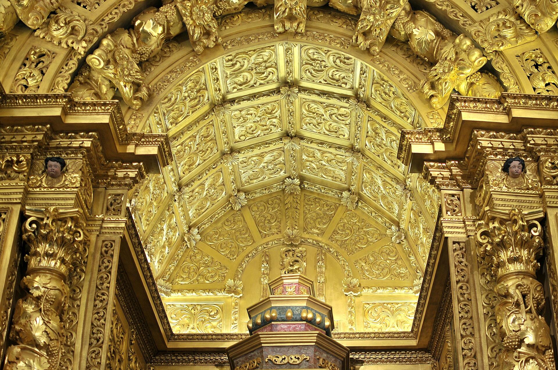 Capela-mor com altar de talha dourada do século XVII. A grande bancada da Irmandade, ornada de talha dourada setecentista, é digna de nota.