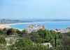 Vista geral da cidade, anel verde, baluartes e pana de muralha com a baia em pano fundo.