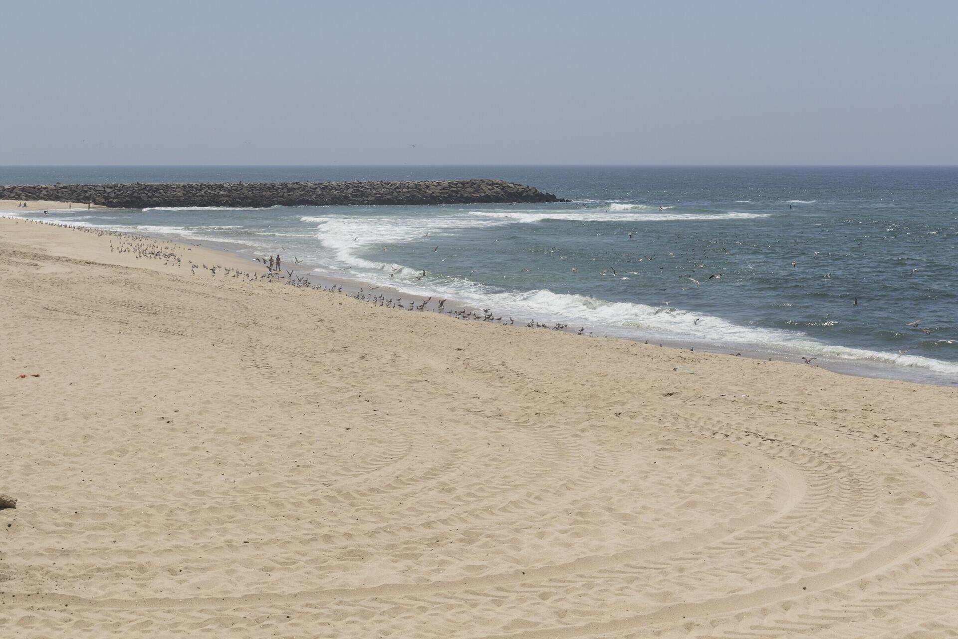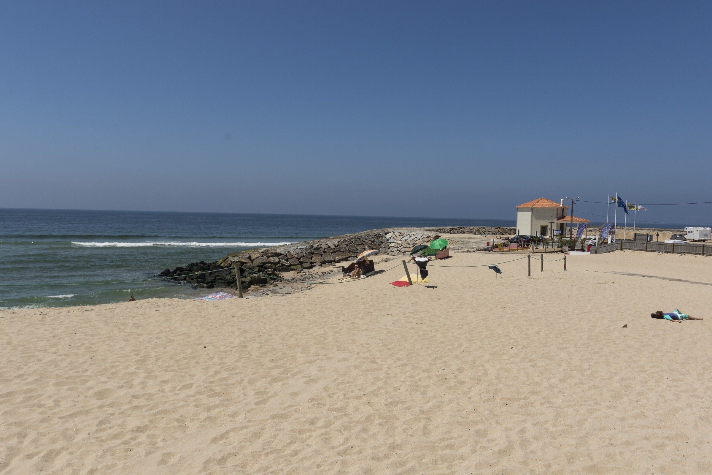Praia pouco movimentada, segura e de acesso fácil, com um imenso areal dividido por um pontão artificial que rodeia uma capela.